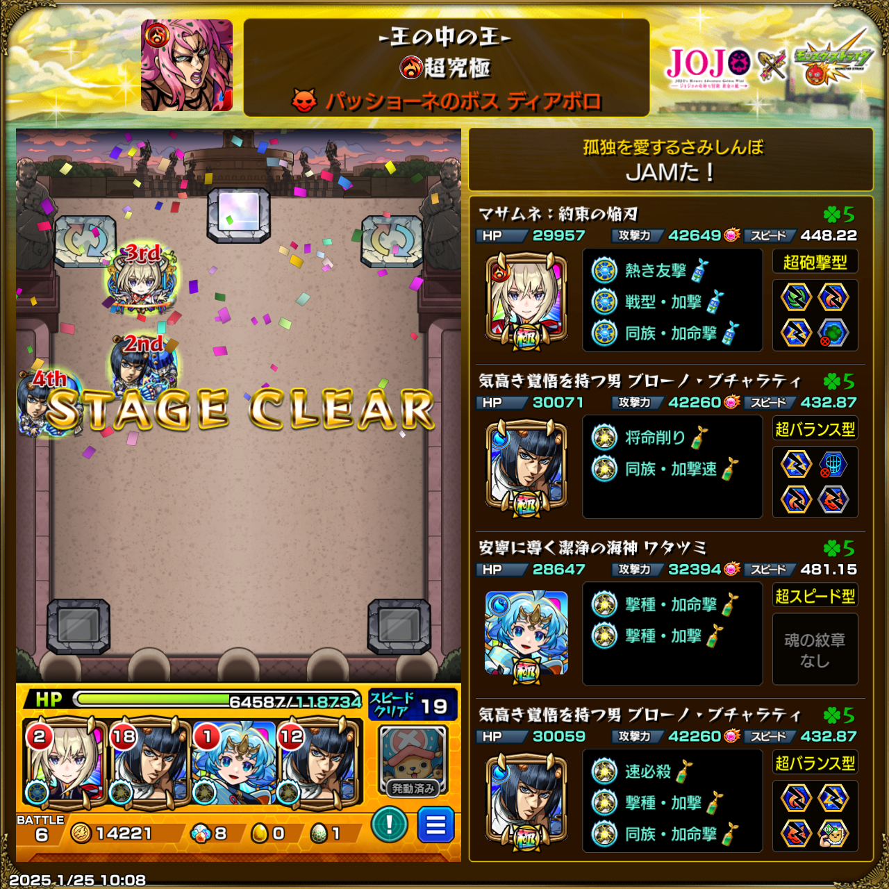 物欲センサーに勝った Screenshot 2025.01.24 次の超究極の為にブチャラティ欲しいと思ってたから石貯めて回したら出たから嬉しい! あとミスタだけでジョジョコラボフルコンプになる、今までのジョジョコラボはコンプしてるからできればミスタ欲しい! そんな感じ♪ 共有:投稿 関連